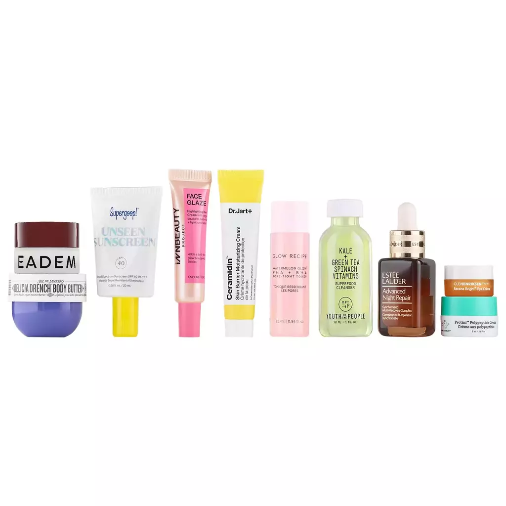Um kit cheio de best-sellers de cuidados com a pele, apresentando favoritos testados e aprovados das marcas que você ama, incluindo Drunk Elephant, Glow Recipe, Dr. Jart+ e muito mais.